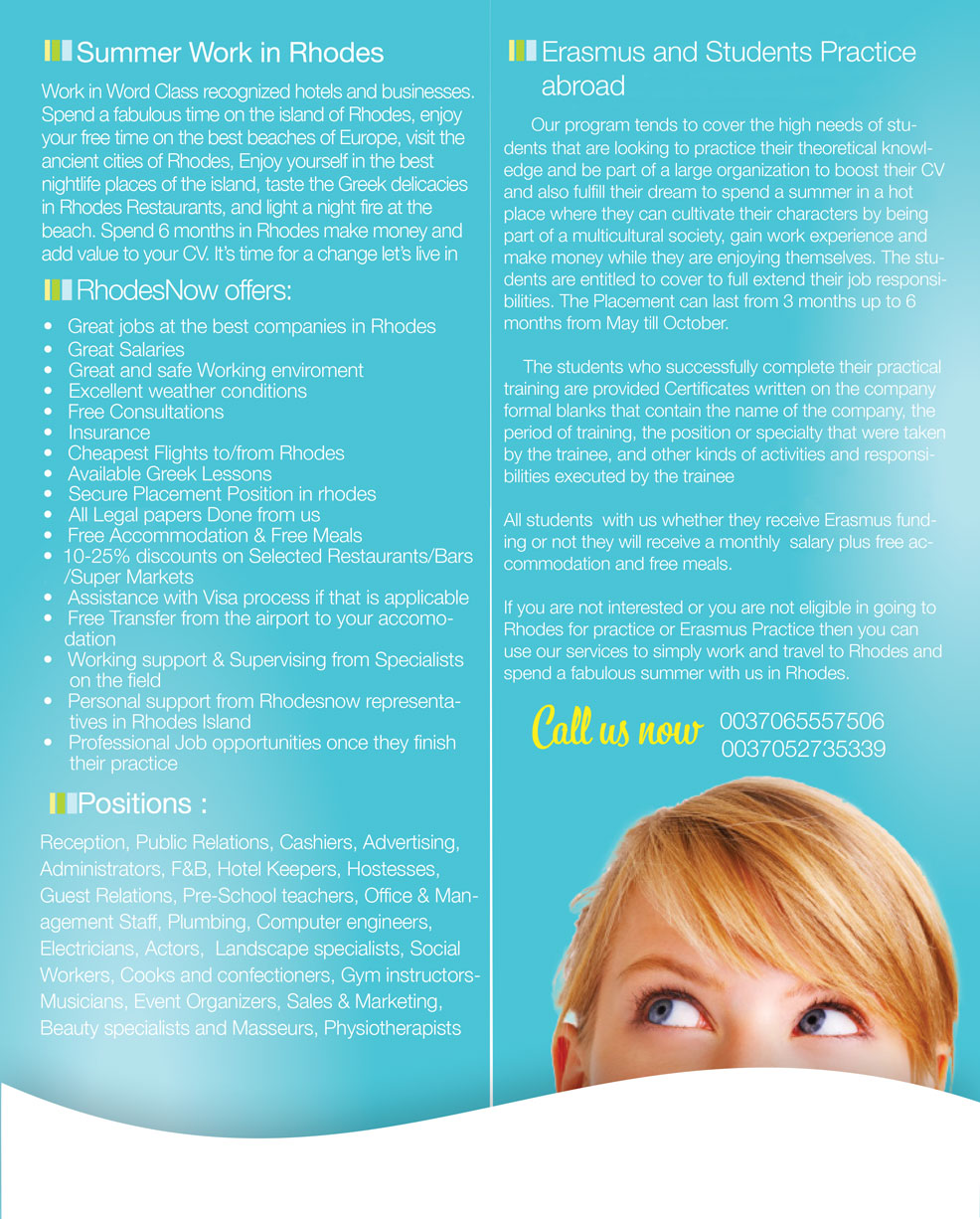Самая лучшая программа стажировки студентов Туризма и Гостеприимства, конечно в Греции и на Кипре, так как практически бесплатная. Все студенты на Кипре и в Греции почуствуют себя настоящими ответственными сотрудниками и будут получать зарплату в размере 350-400 Евро, плюс 50 Евро каждый месяц за хорошо выполненую работу, плюс 150 Евро как бонус за билеты домой, по окончании всей стажировки.